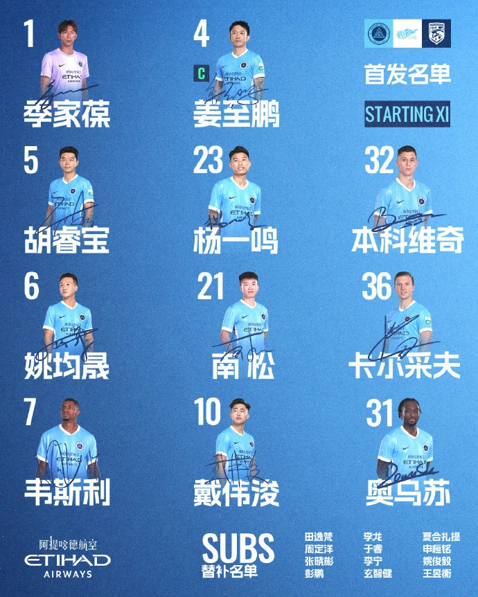 1-季家葆(GK) 4-姜至鹏 5-胡睿宝 6-姚均晟 7-韦斯利(C)10-戴伟浚 21-南松 23-杨一鸣 31-奥乌苏 32-本科维奇 36-卡尔采夫