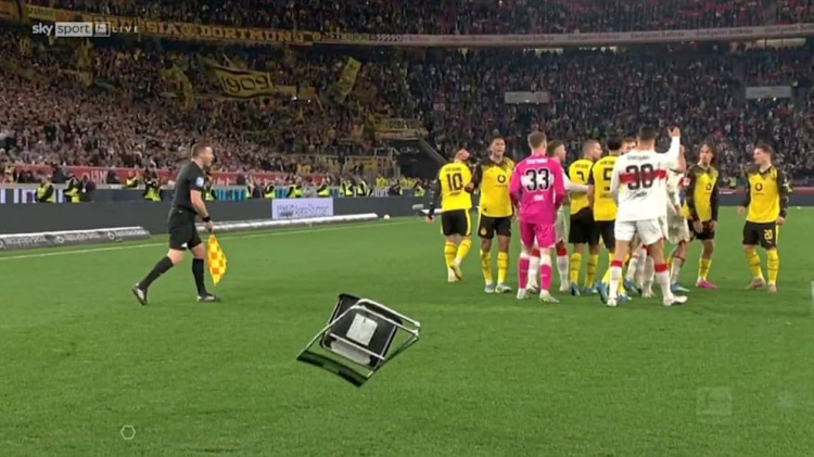多名斯图加特极端球迷翻越围栏,冲入内场区域,甚至来到了电视转播席旁,距离球员仅有几米远。从背景中可以看到,一把折叠椅朝着多特蒙德球员的方向飞来。这把椅子显然属于坐在球门后方区域的摄影师,此后比赛随即结束。