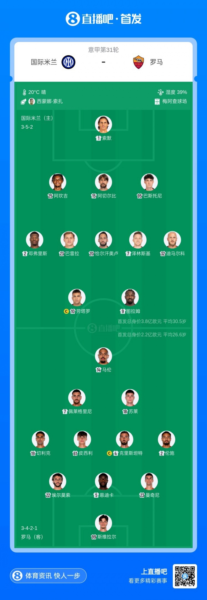 直播吧04月06日讯 意甲第31轮,国际米兰主场迎战罗马,赛前双方首发公布。