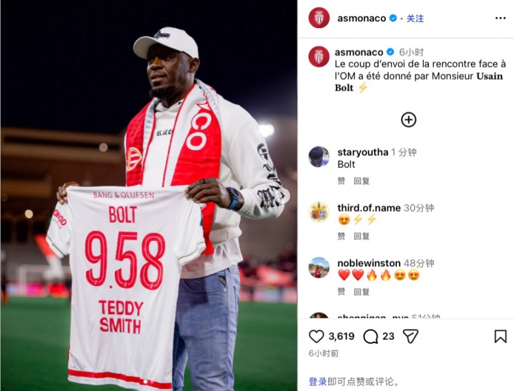 摩纳哥官方ins写道:“欢迎博尔特先生来到现场,为球队与马赛的比赛开球。”