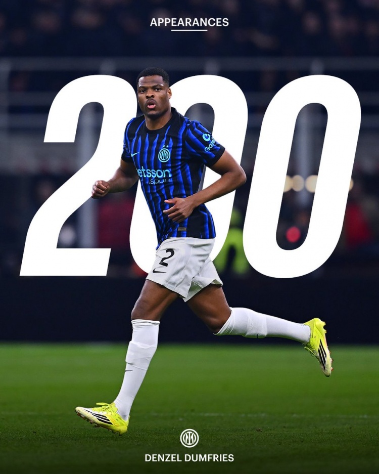 此役是邓弗里斯为国米出战的第200场比赛,他总计贡献25球26助,国米官方社媒晒出海报,祝贺他达成这一里程碑。