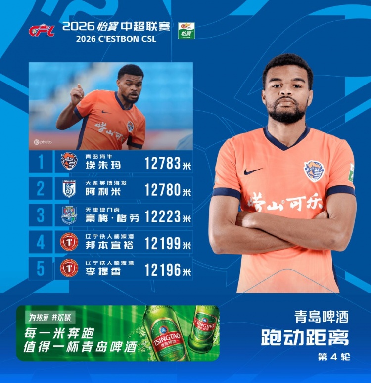 直播吧4月6日讯 今日,中超联赛官方公布了第4轮跑动榜,海牛外援埃朱马连续两轮登顶,本轮他的跑动距离为12783米,英博外援阿利米仅以3米之差列第二位。