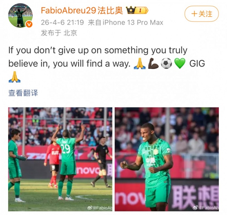 今日国安外援法比奥更新社媒,晒出比赛照并配文勉励自己:“那些你真正相信的东西,只要你不放弃,那总会找到路径。”