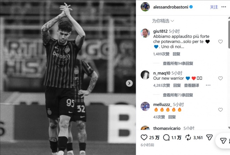 巴斯托尼晒出了自己身穿国米的照片,没有附带任何的配文,评论区则是国米和巴萨球迷在鼓励巴斯托尼。