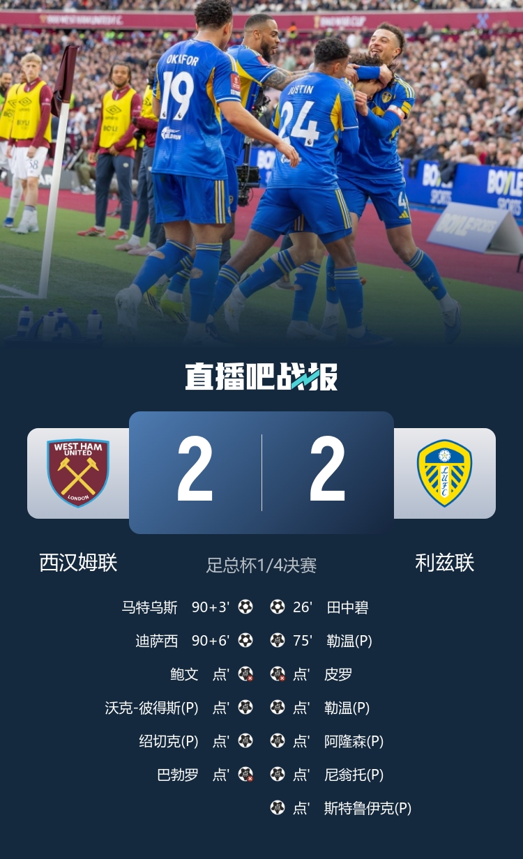 北京时间4月5日23点30分,足总杯1/4决赛,西汉姆联对阵利兹联。上半场,阿雷奥拉和佩利先后贡献神扑,田中碧抽射破门。下半场,卡斯特拉诺斯头球中柱,基尔曼送点,勒温点球命中,鲍文补时中柱,马特乌斯补射扳回一球,迪萨西头球绝平拖入加时。加时中卡斯特拉诺斯破门被吹,鲍文远射再中柱。点球大战,佩利两扑点球,斯特鲁伊克罚进制胜一球。最终利兹联总比分6-4战胜西汉姆联,晋级足总杯四强。