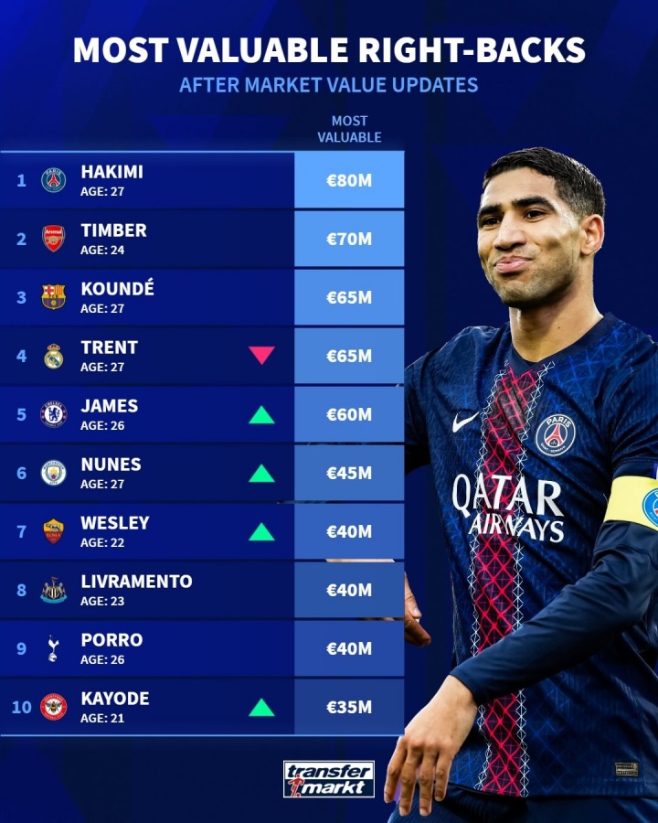 直播吧4月7日讯 德国转会市场公布了最新的足坛右后卫身价排行榜,其中巴黎圣日耳曼右后卫阿什拉夫以8000万欧元,位列第一。