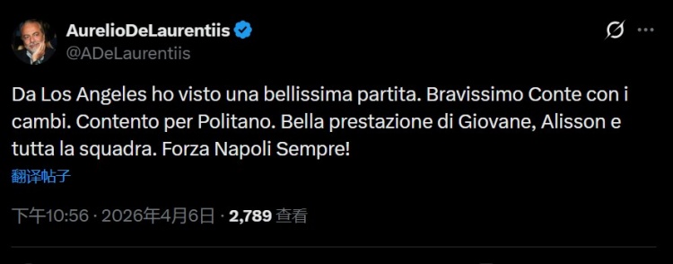 直播吧4月7日讯 在那不勒斯1-0击败米兰夺回意甲第二名后,那不勒斯主席德劳伦蒂斯更新社交媒体。
