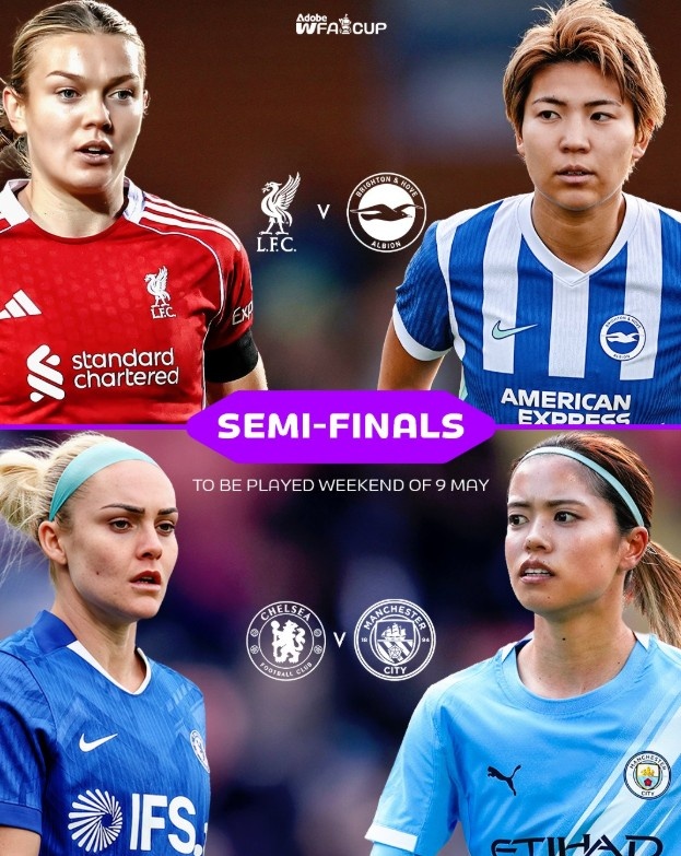 另一场半决赛对阵为曼城vs切尔西,切尔西女足在1/4决赛中2-1击败热刺女足,而曼城女足则以1-0的比分淘汰伯明翰女足。