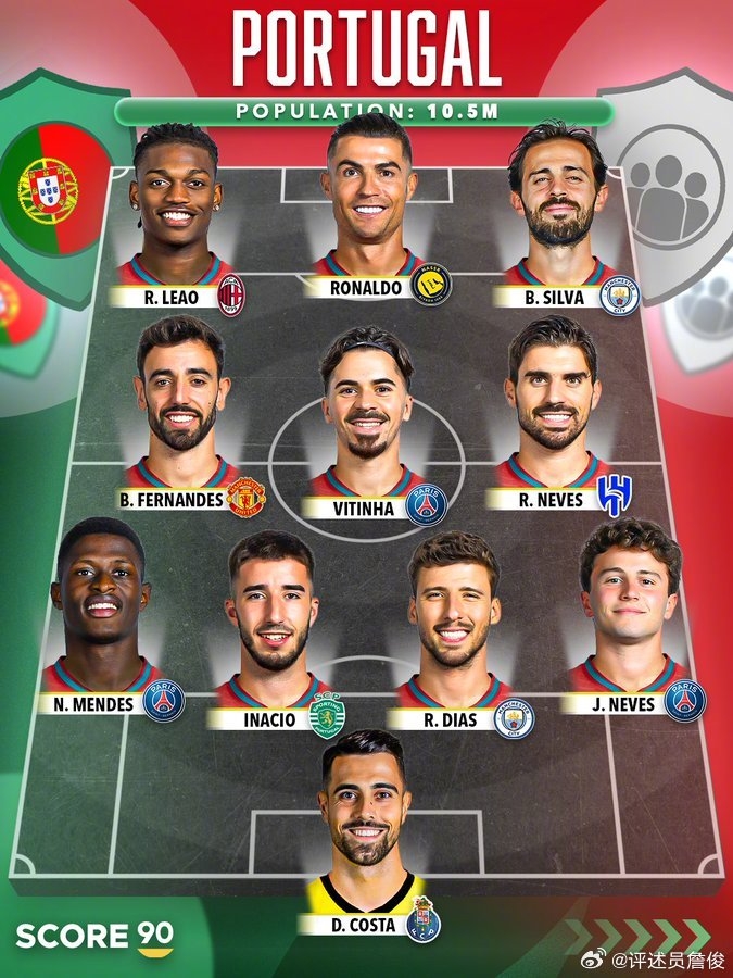 外媒眼中葡萄牙国家队的最强首发。个人觉得一个位置应该会调整:这个赛季在曼城努内斯已经成功转型为右后卫,当然他的防守能力还需要进一步提升,但相信已经能够在国家队拿到主力位置。