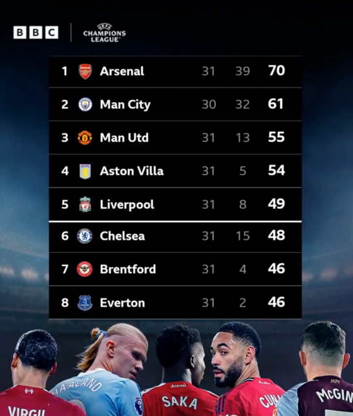 直播吧04月08日讯 欧冠8强首回合,阿森纳1-0击败葡体。此役后,英超凭借本赛季的欧战积分达到25.013分,已经确定获得下赛季的一个额外欧冠名额,英超将有5个欧冠名额。