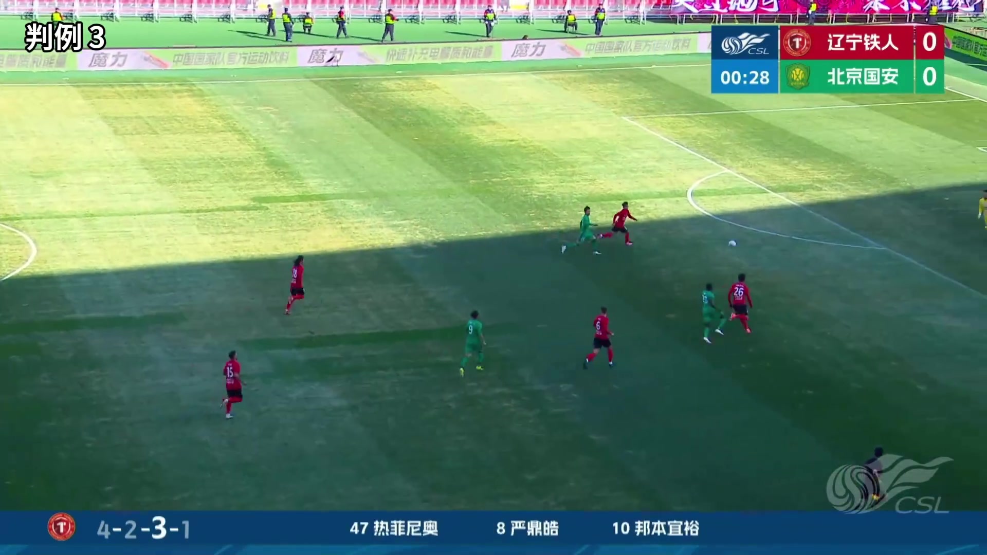 中超联赛第4轮,辽宁铁人楠波湾VS北京国安。比赛第1分钟,辽宁铁人21号守门员在本方罚球区外手触球。裁判员判辽宁铁人21号守门员手球犯规,由北京国安队踢直接任意球恢复比赛,并向辽宁铁人21号守门员出示黄牌警告。VAR未介入。