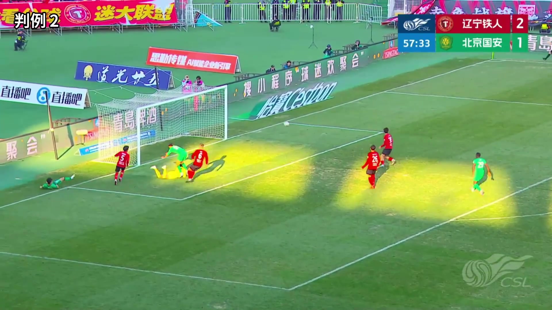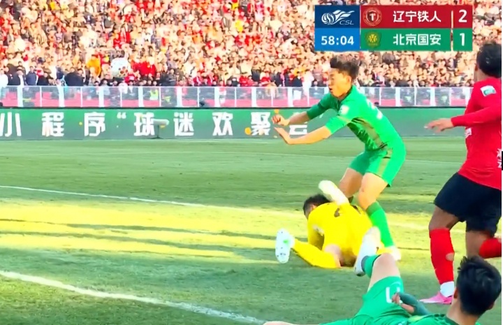 中超联赛第4轮,辽宁铁人楠波湾VS北京国安。比赛第58分钟,北京国安进球。裁判员在球进入球门前鸣哨停止比赛,并判北京国安37号队员在之前的争抢时对对方守门员犯规,进球无效,由辽宁铁人踢直接任意球恢复比赛。VAR未介入。