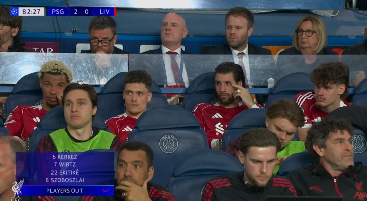 直播吧04月09日讯 巴黎vs利物浦第83分钟,转播给到被换下的埃基蒂克、维尔茨、索博、凯尔凯兹,每个人表情都不太好。