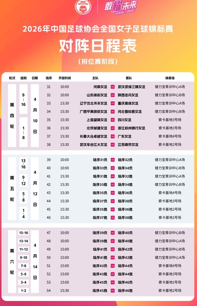 根据2026年全国女足竞赛计划安排,2026年全国女子足球锦标赛排位赛阶段将于4月10日至14日在广东省珠海市和佛山市进行。具体赛程如下: