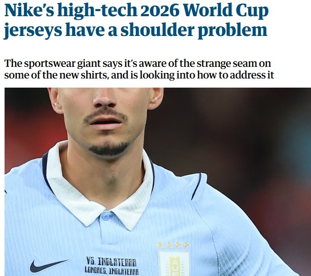 耐克在给《卫报》的一份声明中承认了球衣肩部设计问题,并表示正在研究可能的解决方案:“在最近的国际比赛期间,我们注意到我们的国家队球衣在肩缝处存在一个小问题。虽然不影响球衣性能,但整体外观没有达到应有的标准。”