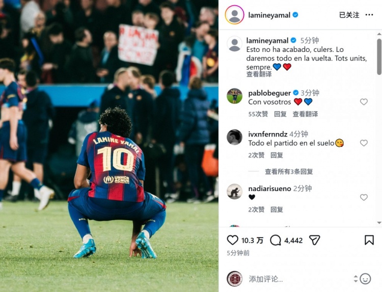 >亚马尔社媒:淘汰赛还没有结束,我们将在次回合倾尽所有