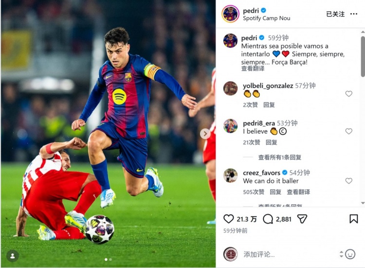 巴萨中场佩德里社媒晒出比赛照片,配文:“只要还有可能,我们就会努力尝试。永远、永远、永远,加油巴萨!”