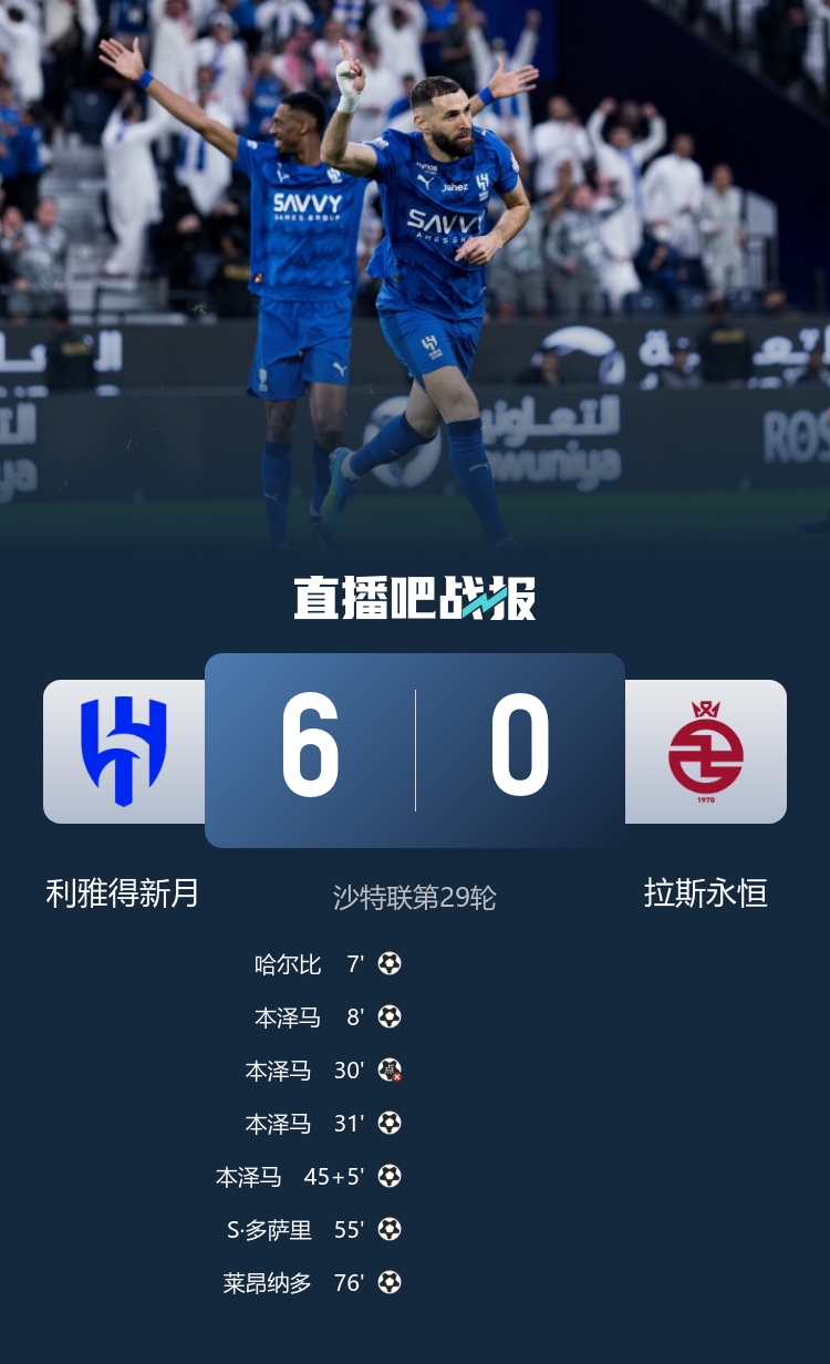 直播吧4月9日讯 北京时间4月9日凌晨2时整,2025-26赛季沙特联第29轮在法赫德国王国际体育场展开角逐,利雅得新月坐镇主场迎战拉斯永恒。上半场哈尔比首开记录,本泽马帽子戏法,马尔科姆助攻+造点,米林科维奇两助攻,下半场多萨里和莱昂纳多破门,本泽马助攻。最终利雅得新月主场6-0大胜拉斯永恒,新月联赛28轮不败,先赛积68分位居第2名,距榜首胜利2分。