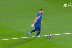 本泽马双响!本泽马主罚点球被卡扎你用腿挡出,随后自己头球补射入网,利雅得新月3-0拉斯永恒!↓