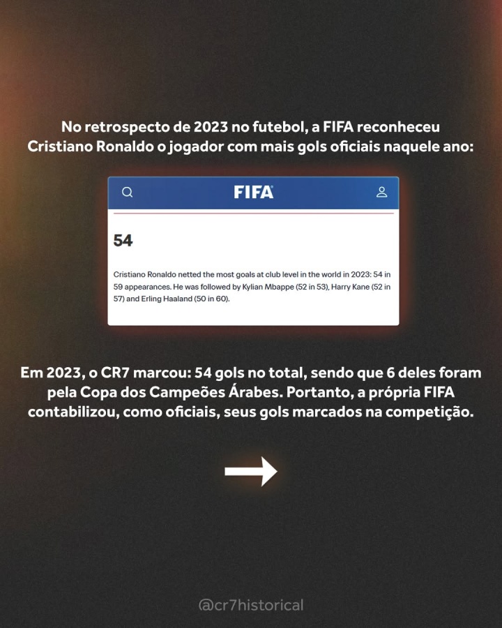 2023年,C罗总计打进54球,其中6球来自阿拉冠。由此可见,国际足联本身已将他在该项赛事中打进的进球,正式计入生涯正式比赛进球数。