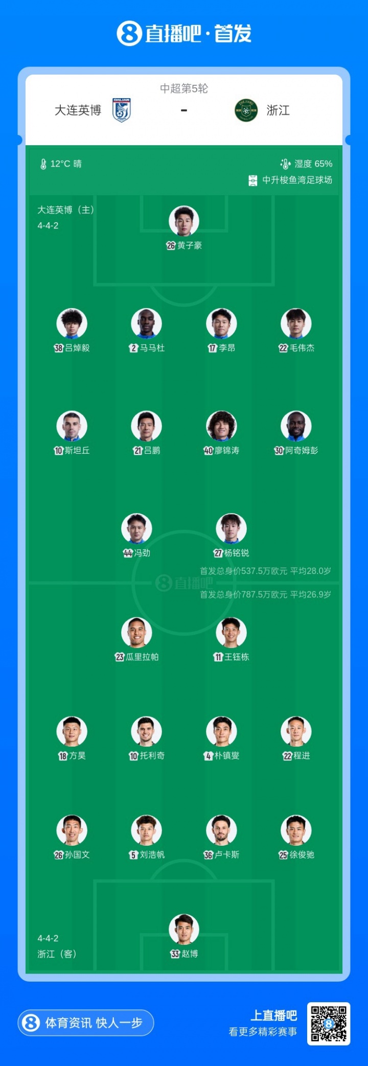 直播吧04月10日讯 今晚19:35,中超第5轮,大连英博vs浙江。赛前首发阵容已经公布。