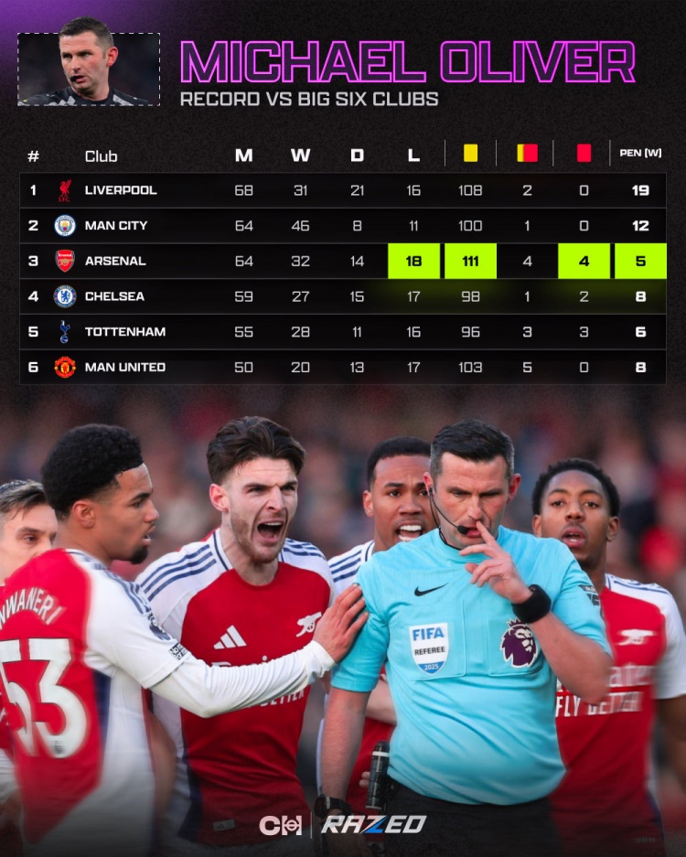 直播吧4月10日讯 作为英超名哨,迈克尔·奥利弗是英足总力捧的主裁判。对于他的执法表现,著名阿森纳博主Connor Humm罗列出了一些对枪手不利的数据。
