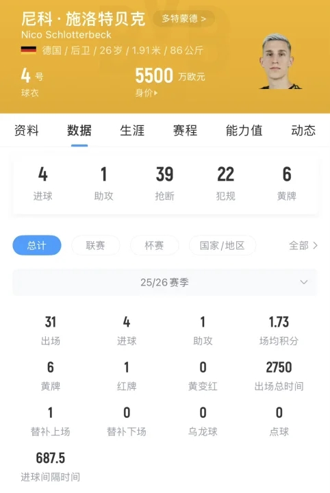 本赛季施洛特贝克代表多特出战31场比赛,贡献4粒进球和1次助攻,目前他的德转身价为5500万欧元。