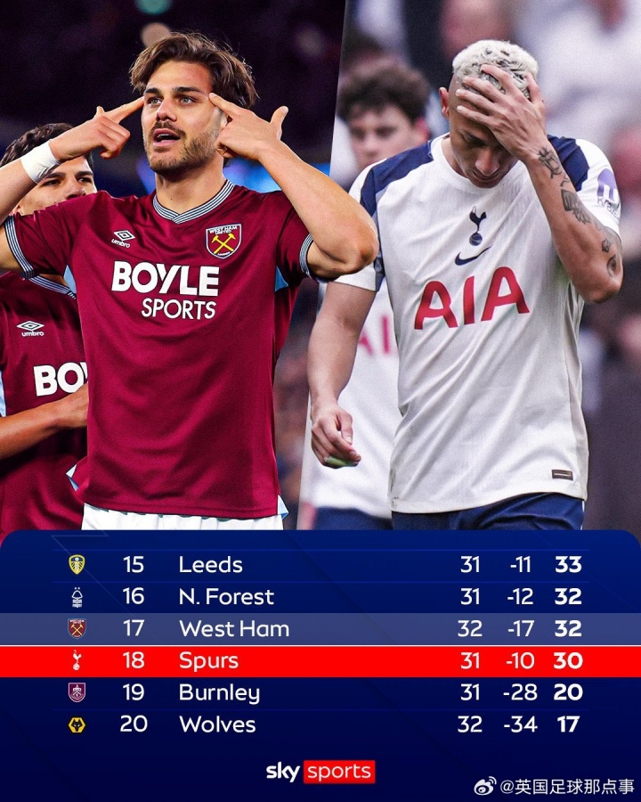 【跌入降级区】在西汉姆4比0狼队后,热刺近18年来首次跌入降级区。