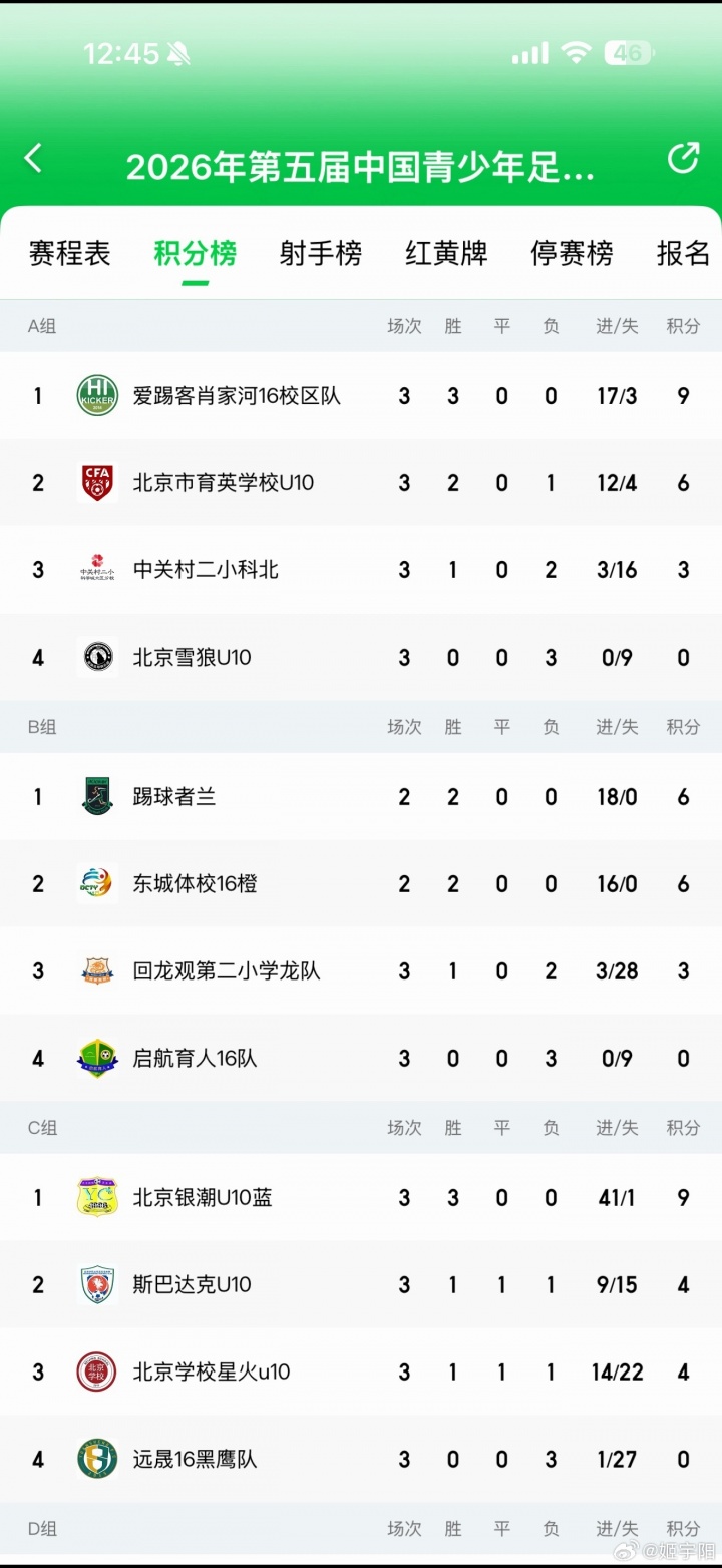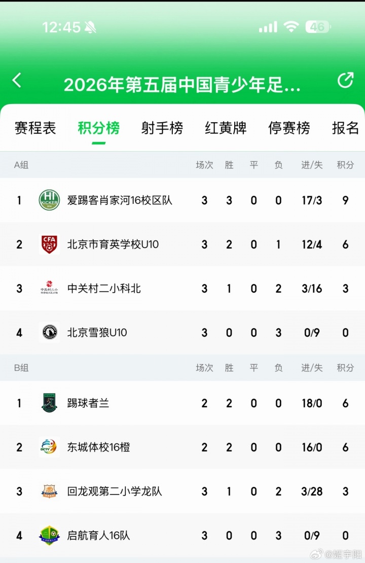 媒体人姬宇阳晒出自己查询到的本场比赛的赛况和积分榜,下半场连进3个乌龙的踢球者兰队在赛前排名小组第一,东城体校16橙队同分排第二,两队互射乌龙“让”小组第一,是为了淘汰赛避开比较强的对手。