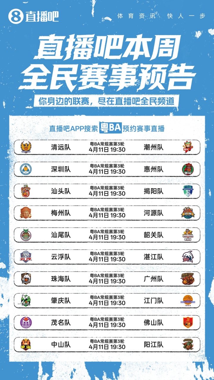 粤BA常规赛第3轮本周末战火重燃,10场精彩比赛轮番上演,珠海vs广州,深圳vs惠州、汕头vs揭阳……还有多场对决蓄势待发,篮球激情将彻底引爆赛场!