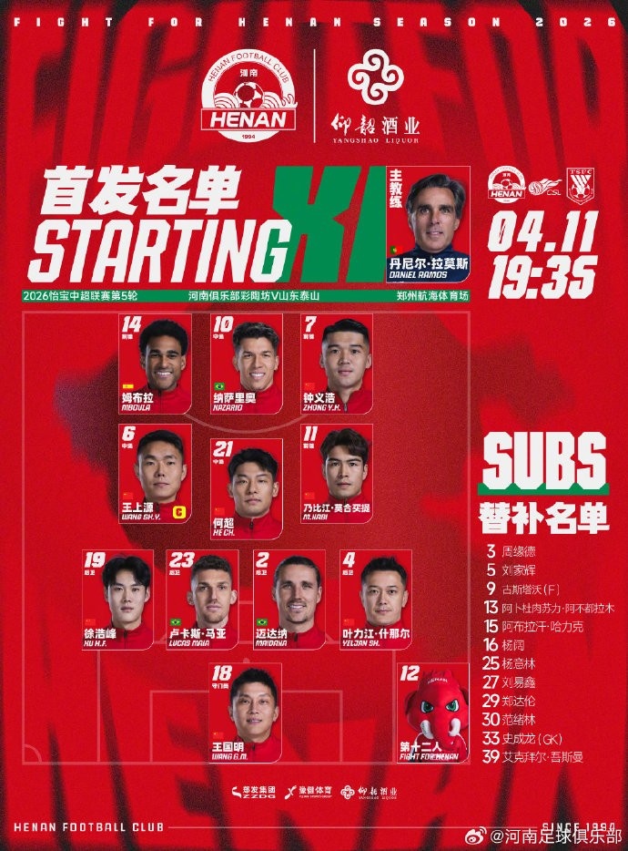 2026中超第5轮 河南俱乐部彩陶坊VS山东泰山 首发及替补队员名单