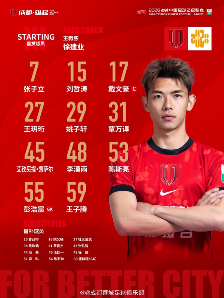 成都蓉城希拉谷vs深圳二零二八比赛首发名单出炉!蓉城青年军,雄起!