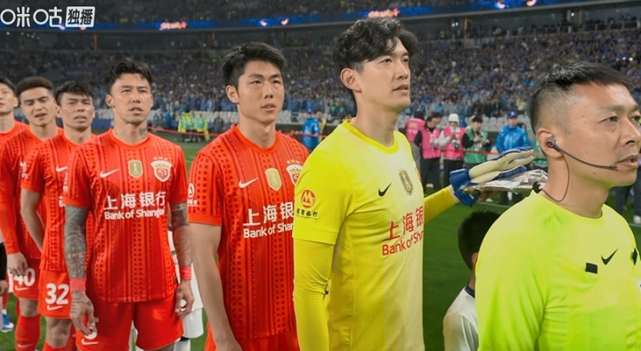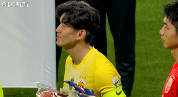 赛前列队时,颜骏凌用门将手套为一旁的小球童挡雨