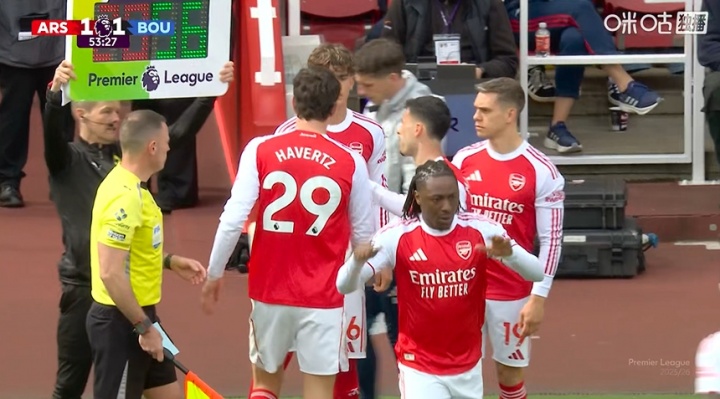 比赛第53分钟,阿森纳做出换人调整,埃泽、特罗萨德、道曼替补登场,换下哈弗茨、马丁内利、马杜埃凯。