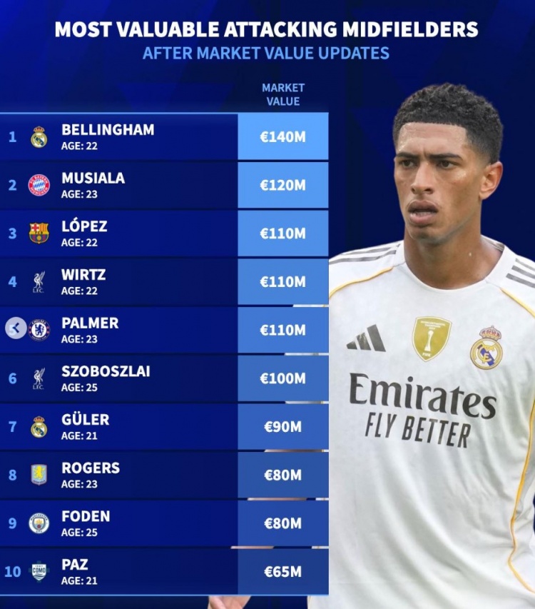 直播吧4月11日讯 《转会市场》统计了前腰位置球员身价情况,贝林厄姆力压穆西亚拉居首。