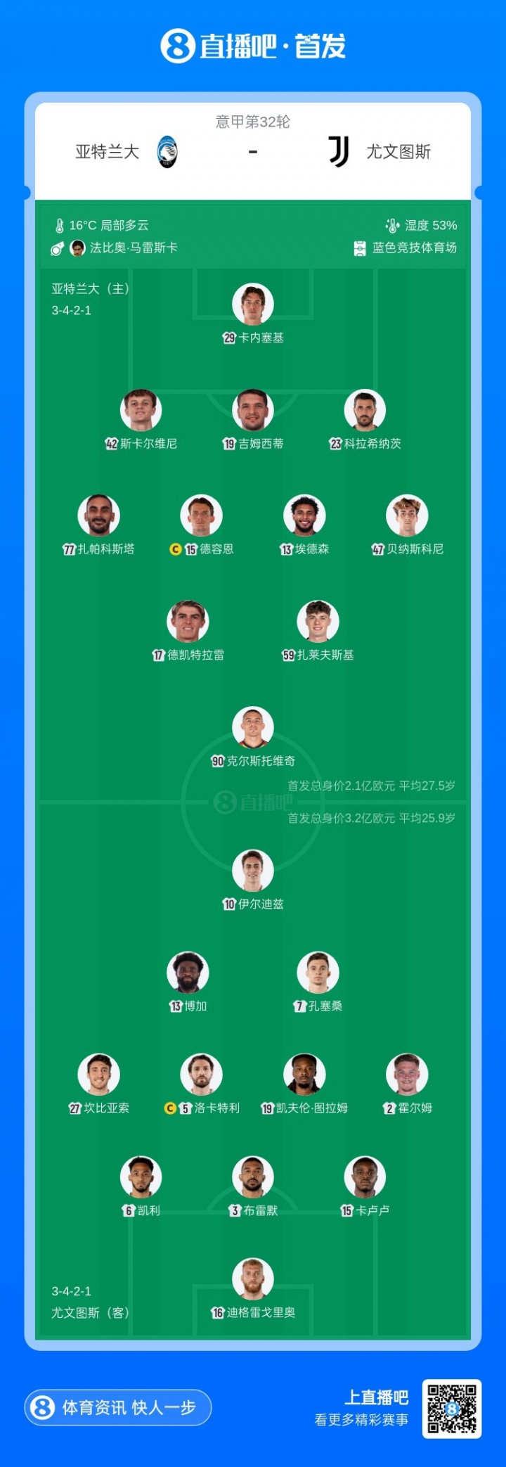 亚特兰大首发:29-卡内塞基、24-斯卡尔维尼、19-吉姆西蒂、23-科拉希纳茨、77-扎帕科斯塔、15-德容恩、13-埃德森、47-贝纳斯科尼、17-德凯特拉雷、59-扎莱夫斯基、90-克尔斯托维奇