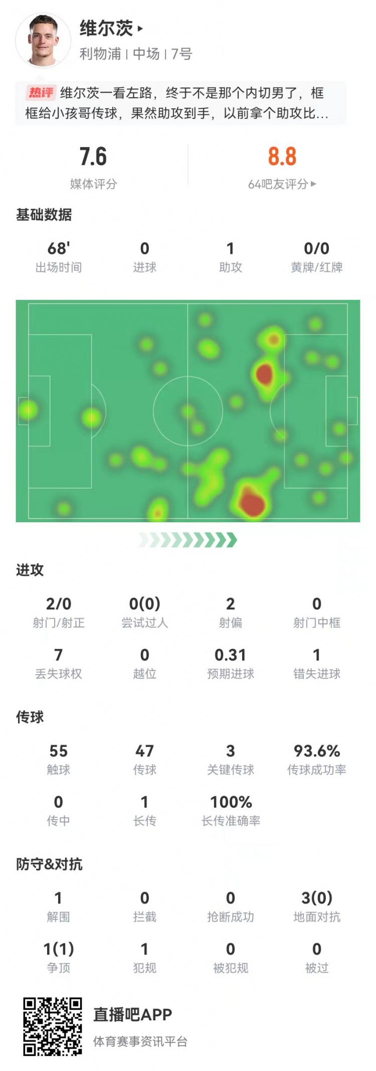 直播吧4月12日讯 利物浦在本轮英超对阵富勒姆,维尔茨本场数据如下: