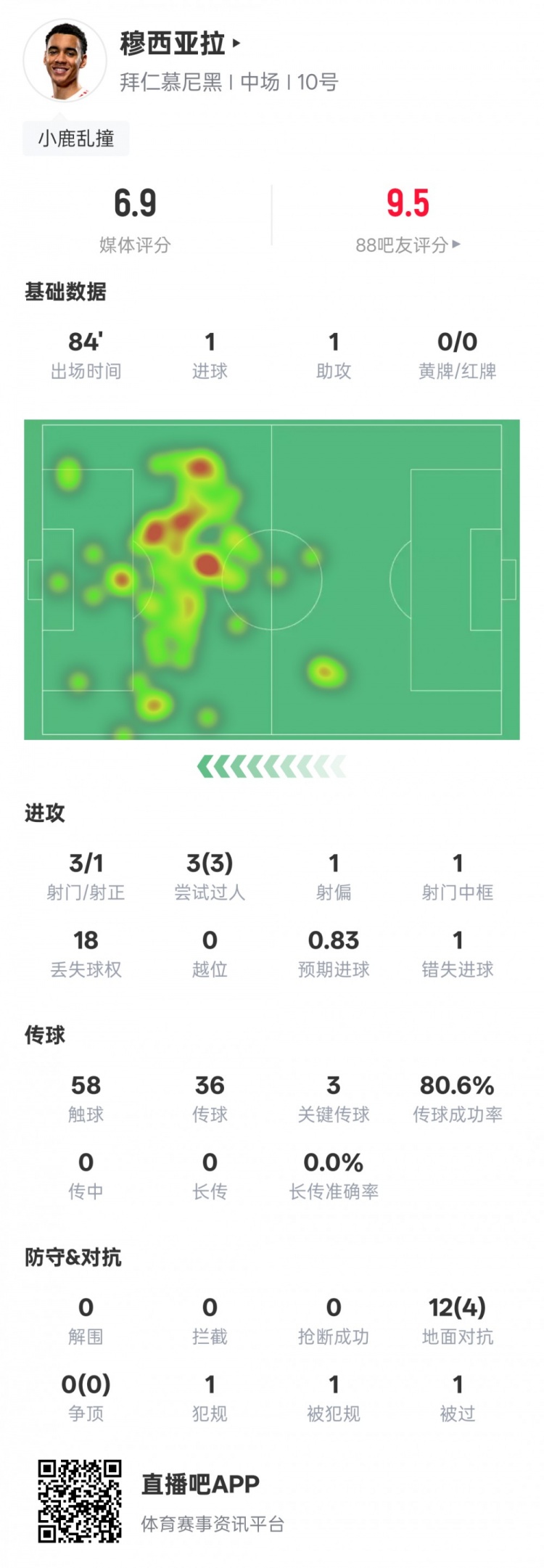直播吧4月12日讯 德甲第29轮,拜仁客战圣保利,穆西亚拉首发出战,传射建功,另外他还有3次过人成功和3次关键传球,评分6.9。