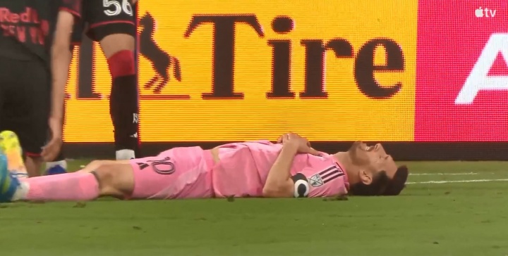 梅西小禁区前扣过对手,兜射擦着门柱偏出后躺在地上叹息