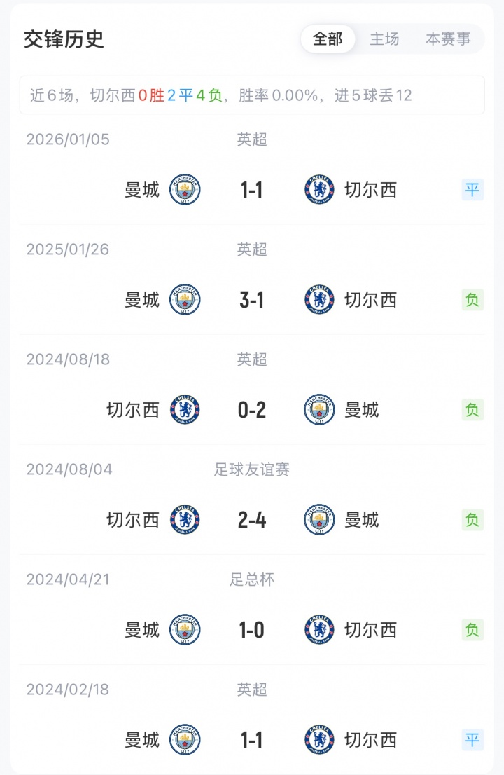 切尔西各项赛事已经5年不胜曼城,此前12场对曼城9负3平,他们上次击败曼城还是2021年的欧冠决赛。