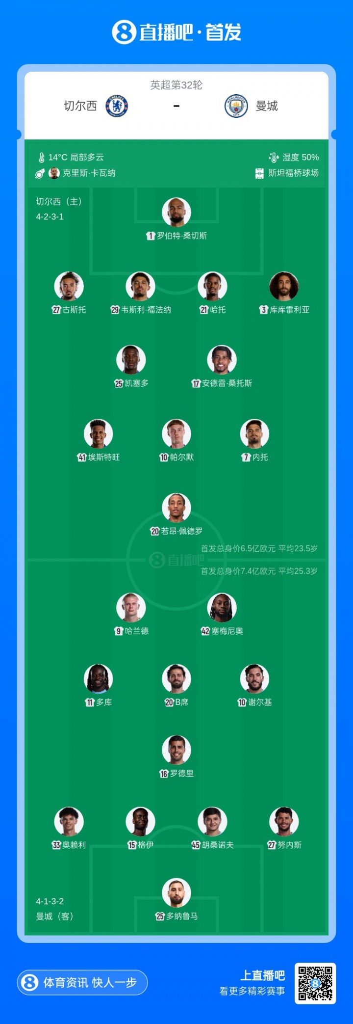 曼城首发:25-多纳鲁马、27-努内斯、45-胡桑诺夫、15-格伊、33-奥赖利、16-罗德里、20-B席、42-塞梅尼奥、10-谢尔基、11-多库、9-哈兰德