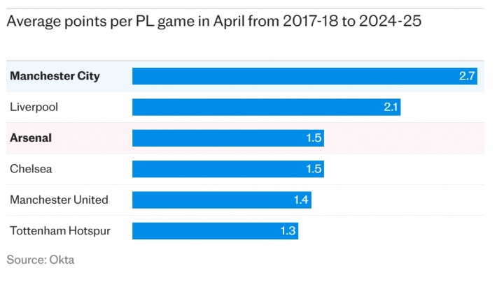相比之下,阿尔特塔执教的阿森纳则在4月表现低迷,阿尔特塔执教以来,阿森纳在4月的胜率在一年中最低。