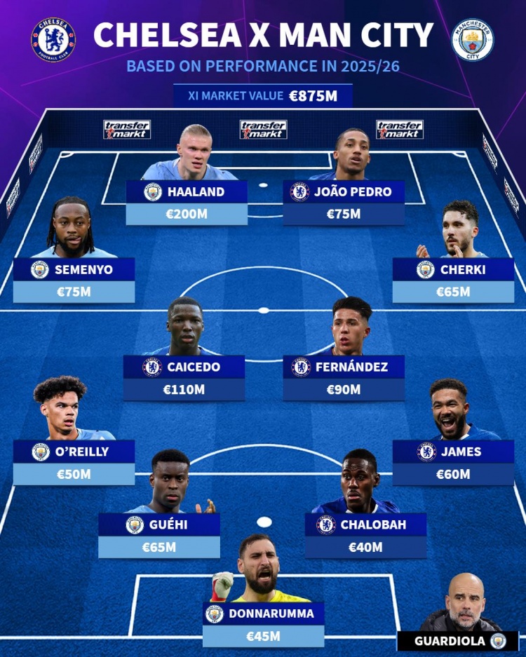 直播吧4月12日讯 德国转会市场基于球员本赛季的表现,排出了切尔西+曼城阵容,哈兰德、凯塞多、恩佐、多纳鲁马在列。
