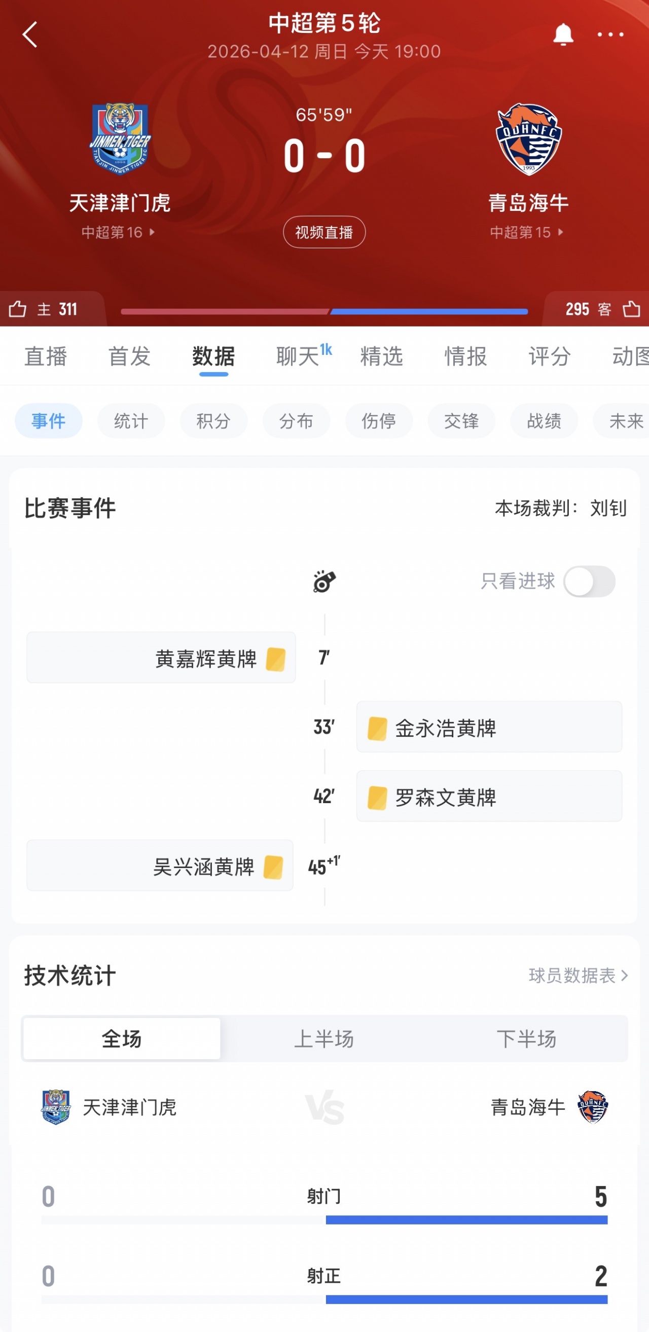 津门虎vs海牛比赛进行到第66分钟,主场作战的津门虎仍然0射门