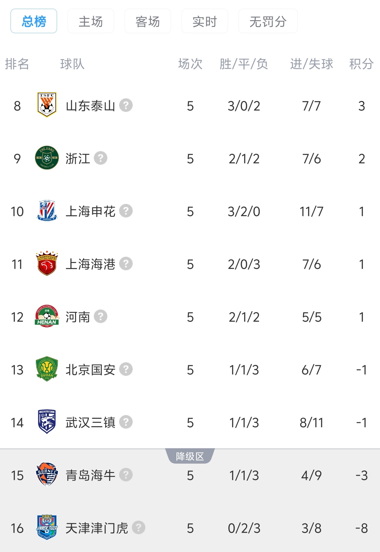直播吧04月12日讯 2026赛季开局中超9队被罚分,目前9支球队已全部结束前五轮赛程。5队转正4队仍负分,津门虎五轮不胜积-8分垫底。