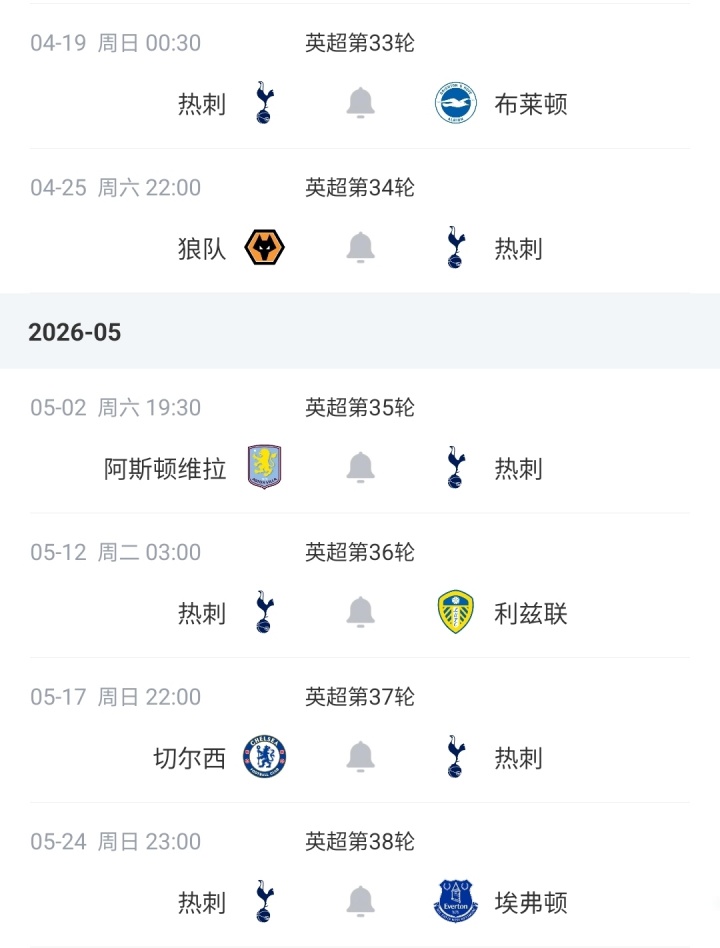 保级决战!热刺剩余赛程:3主3客 客战维拉+切尔西 末轮踢埃弗顿