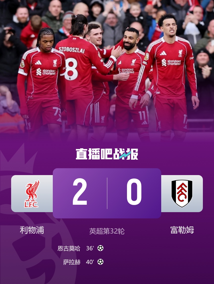 直播吧4月12日讯 北京时间00:30,英超第32轮利物浦vs富勒姆,比赛在安菲尔德球场打响!上半场,恩古莫哈禁区内晃动,右脚精彩兜射破门!随后恩古莫哈再次策动攻势,加克波助攻萨拉赫再下一城!柯蒂斯·琼斯内收肌受伤无奈伤退。下半场,双方均无建树。最终,利物浦主场2-0击败富勒姆,终结各项赛事3连败,先赛领先身后的切尔西4分。