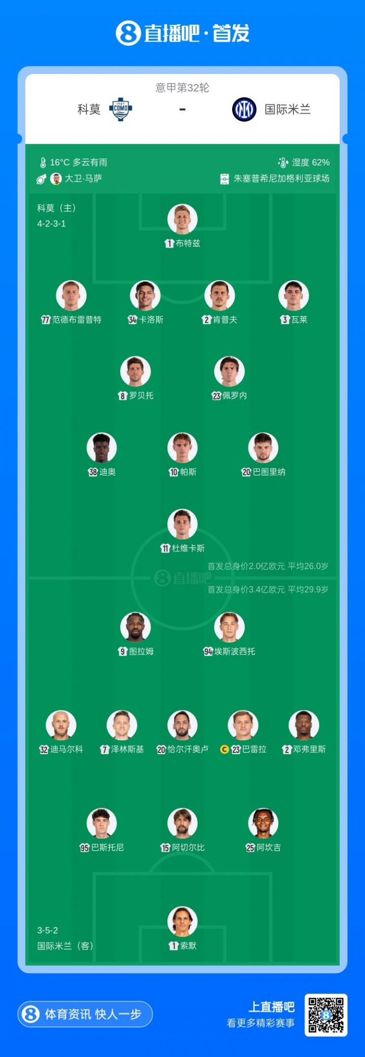 科莫首发:1-布特兹、77-范德布雷普特、34-迭戈·卡洛斯、2-肯普夫、3-瓦莱、8-罗贝托、23-佩罗内、38-迪奥、10-尼科·帕斯、20-巴图里纳、11-杜维卡斯
