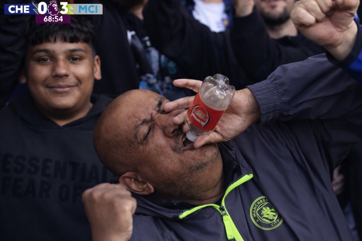 直播吧04月13日讯 本轮英超,曼城3-0完胜切尔西,在追赶阿森纳的路上拿下一场大战。比赛第69分钟,镜头给到了一个拿着印有阿森纳瓶子的老哥,尽情地嘲讽庆祝。
