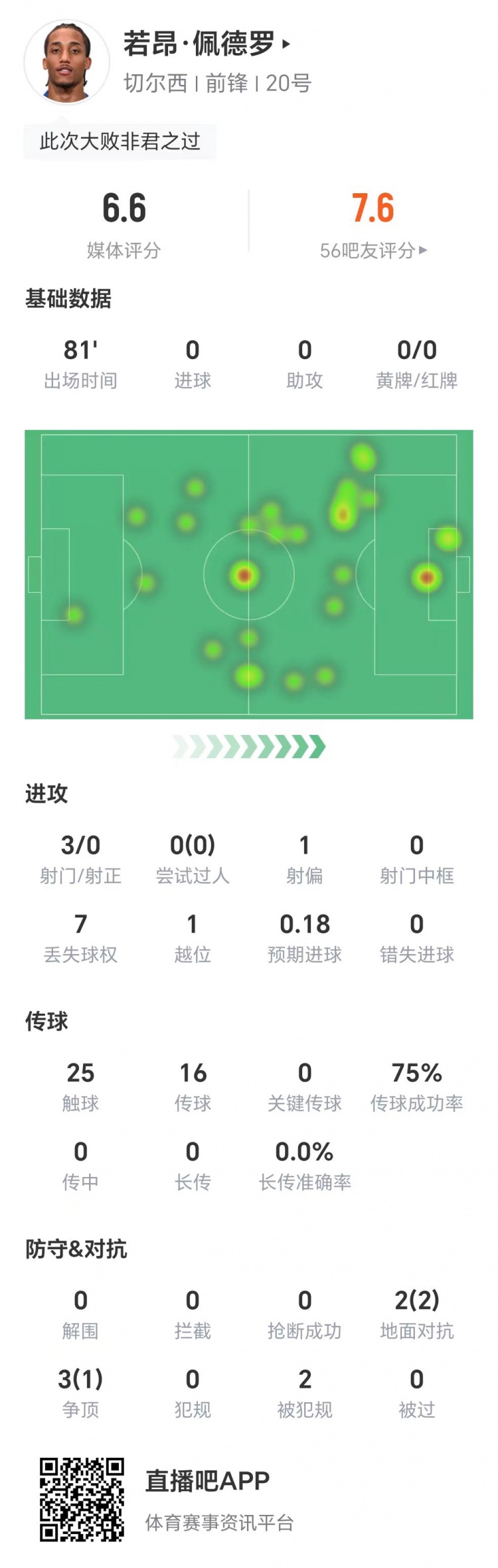 技术统计数据显示,若昂·佩德罗本场比赛3射零正,无过人,无关键传球,两次地面对抗全部成功,获评6.6分。